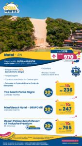 Inclui passagem aérea desde Porto Alegre, hospedagem, city tour com Praia do Camurupim. Passeios a Praia de Pipa e Praia de Genipabu. Consulte passagem para saída da sua cidade.
